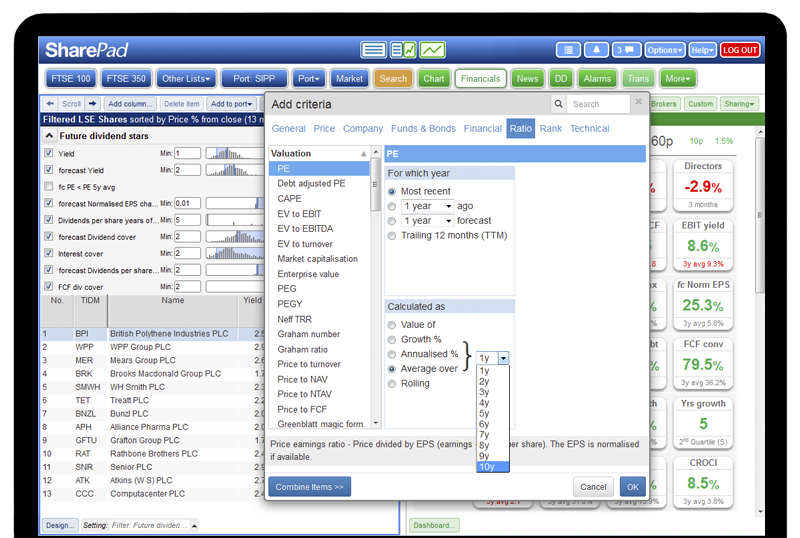 Choose from hundreds of different criteria - including growth, annualised growth and multi-year averages for most items. You can even combine items e.g. forecast PE lower than 5y average PE.