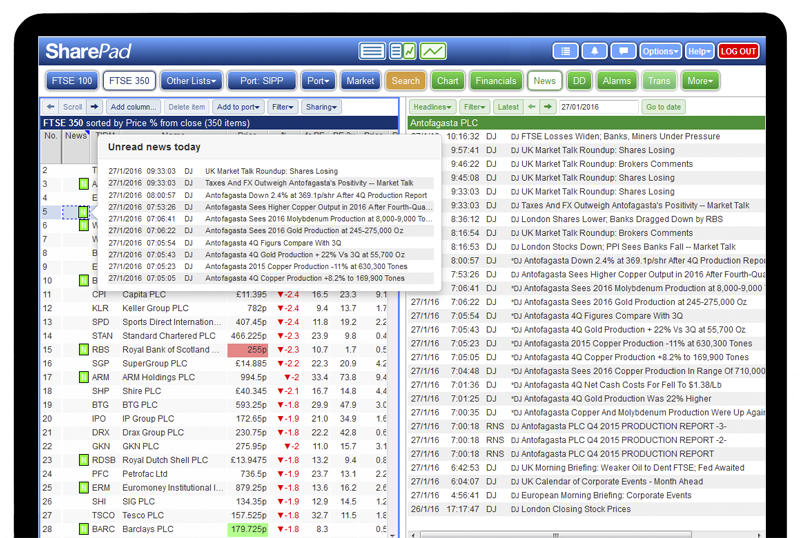 You'll want to keep abreast of breaking news particularly for your current investments. Add news flags to your portfolio and list views to alert you to incoming news stories or have alarms sent to your phone. Use the dedicated News view to read stories in detail and to check the news history for stocks you are researching. ShareScope's news includes regulatory releases and market commentary from Dow Jones Newswires - a leading professional news service.
