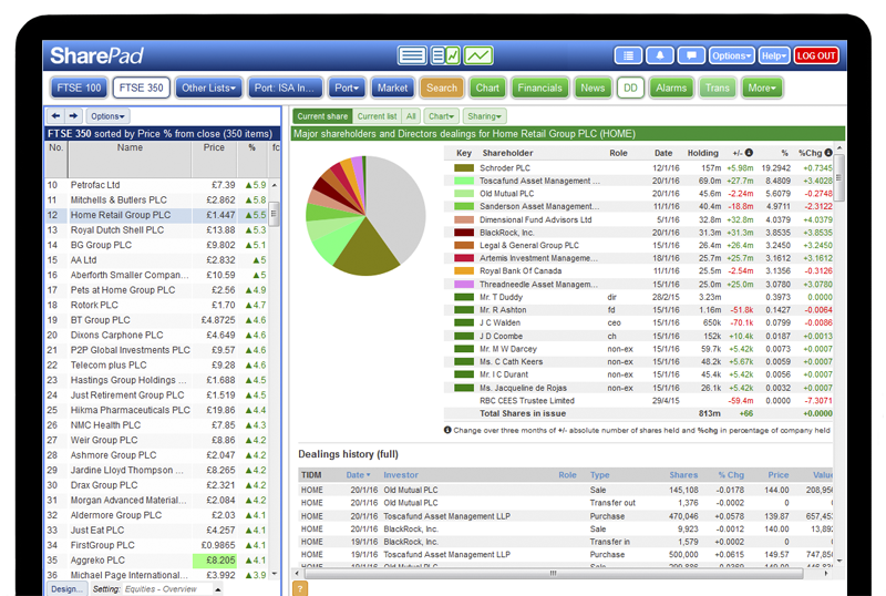 Investors often take their cue from the buying and selling activity of company directors and institutional investors. For example, directors buying when the share price has fallen sharply can be a sign of confidence in the company's prospects. ShareScope provides a breakdown of institutional shareholders, directors and their recent activity. See whether major investors have been net buyers or sellers over the previous 3 months.